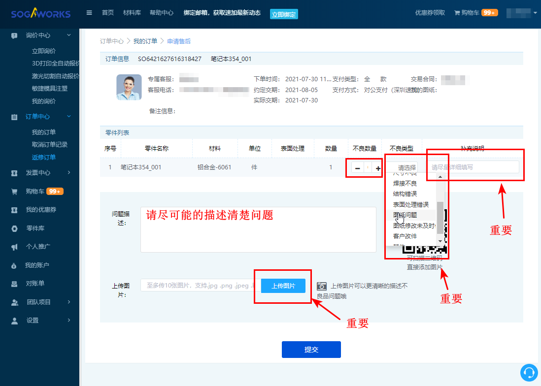 2.零件寄回時,請務(wù)必將訂單號、專屬售前的名字寫在卡片上隨貨一起寄回。