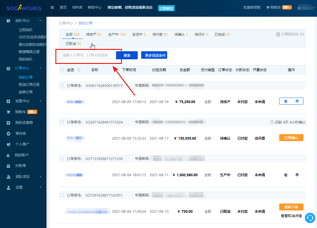 3. 可輸入訂單號/訂單名稱查詢,找到需取消的訂單