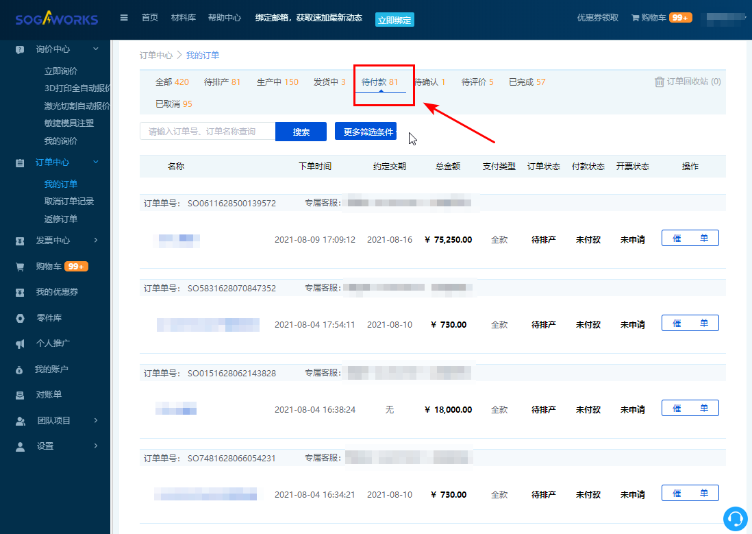 3. 點擊【待付款】,進(jìn)入代付款訂單列表